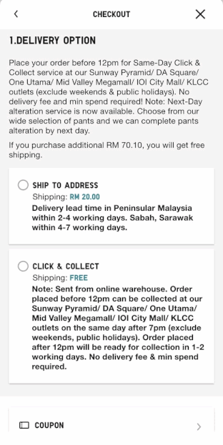 (Delivery to Home Address or Click & Collect at any UNIQLO Stores).4. To utilize coupon (if applicable)