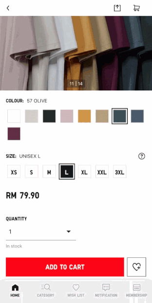 1. Find desired item. Select preferred size and colour and click 【ADD TO CART】.